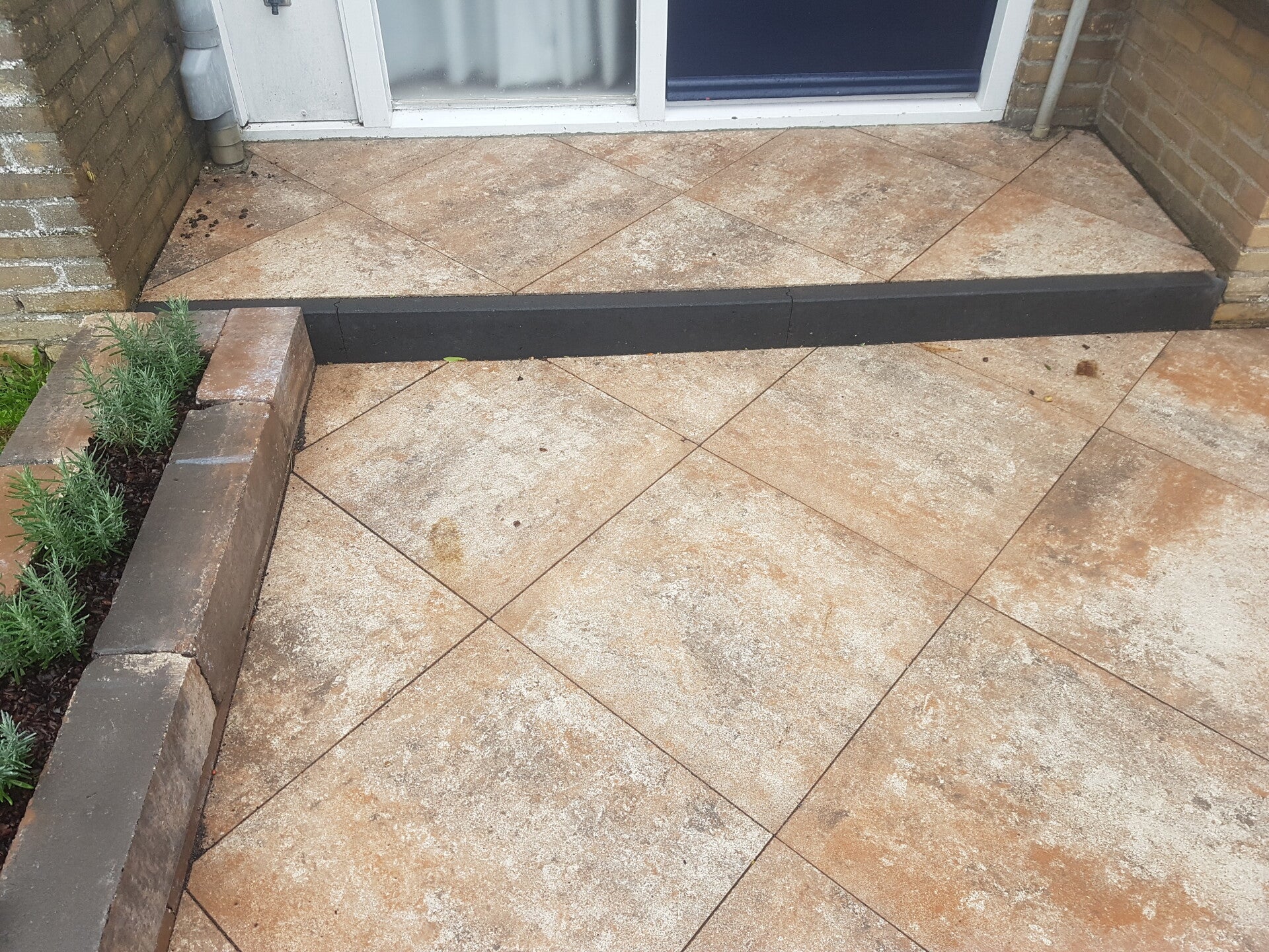 Ons werd gevraagd om mee te denken in het ontwerp. Het startidee was redelijk symmetrisch en de kleur was grijs/antraciet. We zijn op totaal was anders uitgekomen; Vanwege de kleur van het huis (geel) hebben we gekozen voor een wat warmere kleur tegels. Om wat meer dynamiek aan het totaal te geven zijn de tegels zijn diagonaal gelegd. Er zat daardoor wel wat meer slijpwerk in, maar het resultaat mag er wezen.