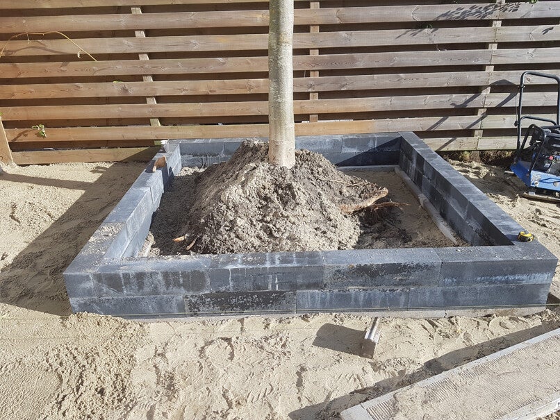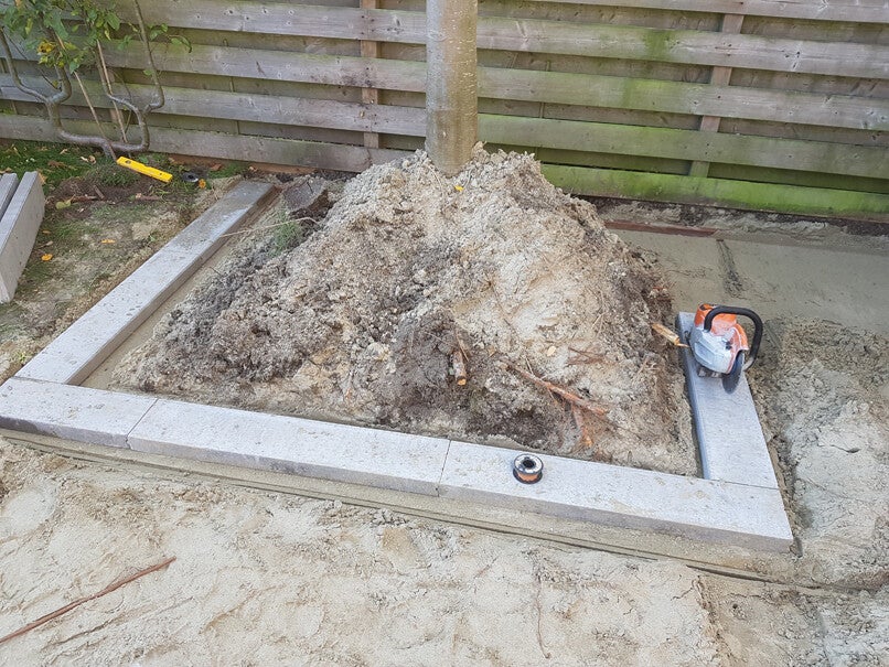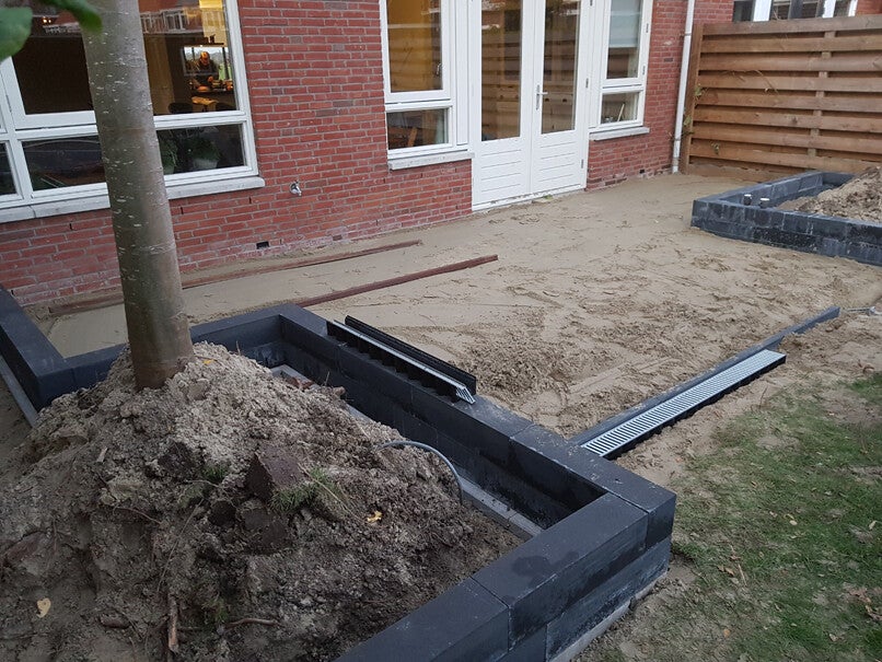 Er is een drainagebuis onder de wortels gelegd met het uiteinde van de buis boven de grond zodat er zomers water kan worden gegeven.