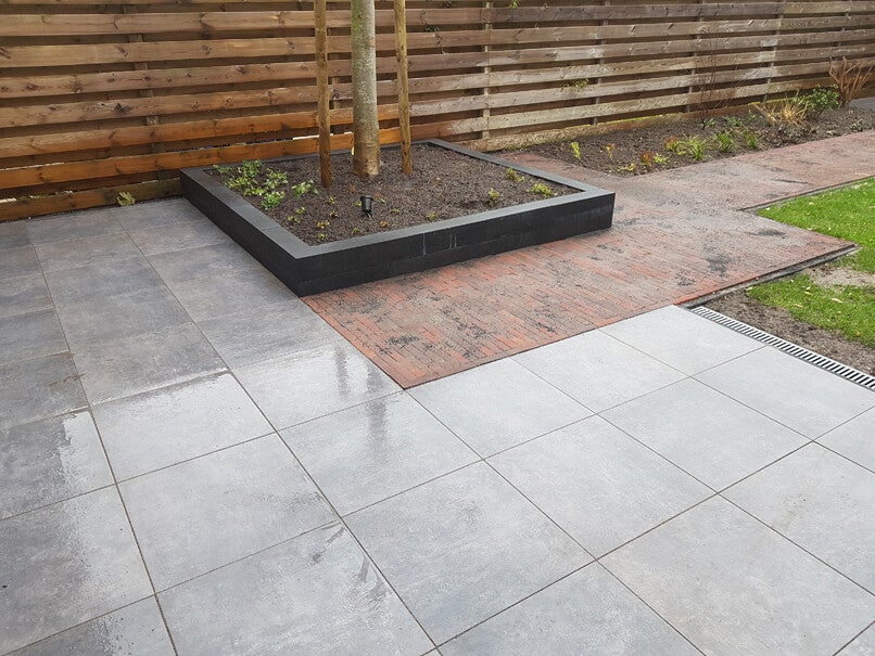 De vlonder onder de overkapping is van houtcomposiet, wat gemaakt is van gerecycleerd plastic en houtvezels. De tegels zijn keramisch en de paadjes zijn met gebakken klinkers gelegd. Er zijn ledspots geplaatst met een lichtsensor met tijdschakelaar.