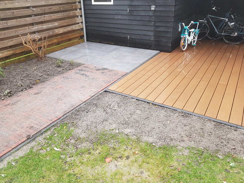De vlonder onder de overkapping is van houtcomposiet, wat gemaakt is van gerecycleerd plastic en houtvezels. De tegels zijn keramisch en de paadjes zijn met gebakken klinkers gelegd. Er zijn ledspots geplaatst met een lichtsensor met tijdschakelaar.